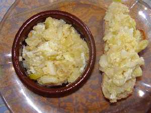 es. All ingredients are sliced very finely, fried in olive oil, and then mixed with the beaten eggs. The dish is served hot, and is generally served as an appetizer accompanied with wine, or as a side dish accompanying a fish entree.